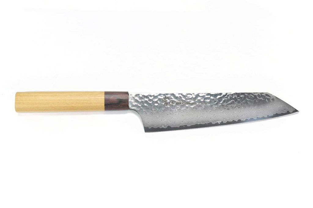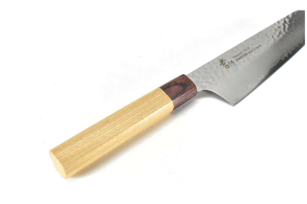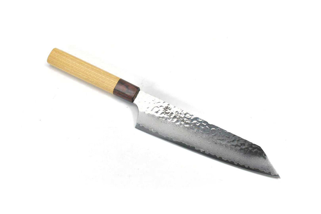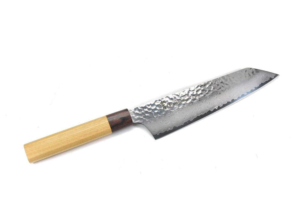 This is a Sakai Takayuki Japanese Style Kengata Gyuto(Kiritsuke Style Gyuto) 190 mm, made of VG-10 Stain Resistant Steel at the core of the blade, squeezed into 32 Layers Damascus Steel with "Keyaki" Handle. Beautiful Damascus pattern & Hammered Finish!!!