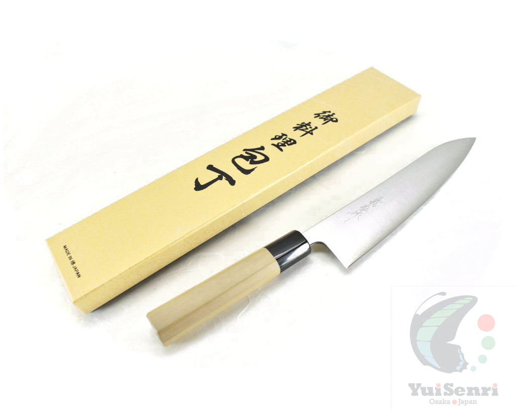 This is a Yoshihiro Professional Gyuto, made of Aogami Super at the core of the blade, squeezed into Stainless Steel(known as "Clad/Warikomi method") with traditional Octagonal Wood Handle.