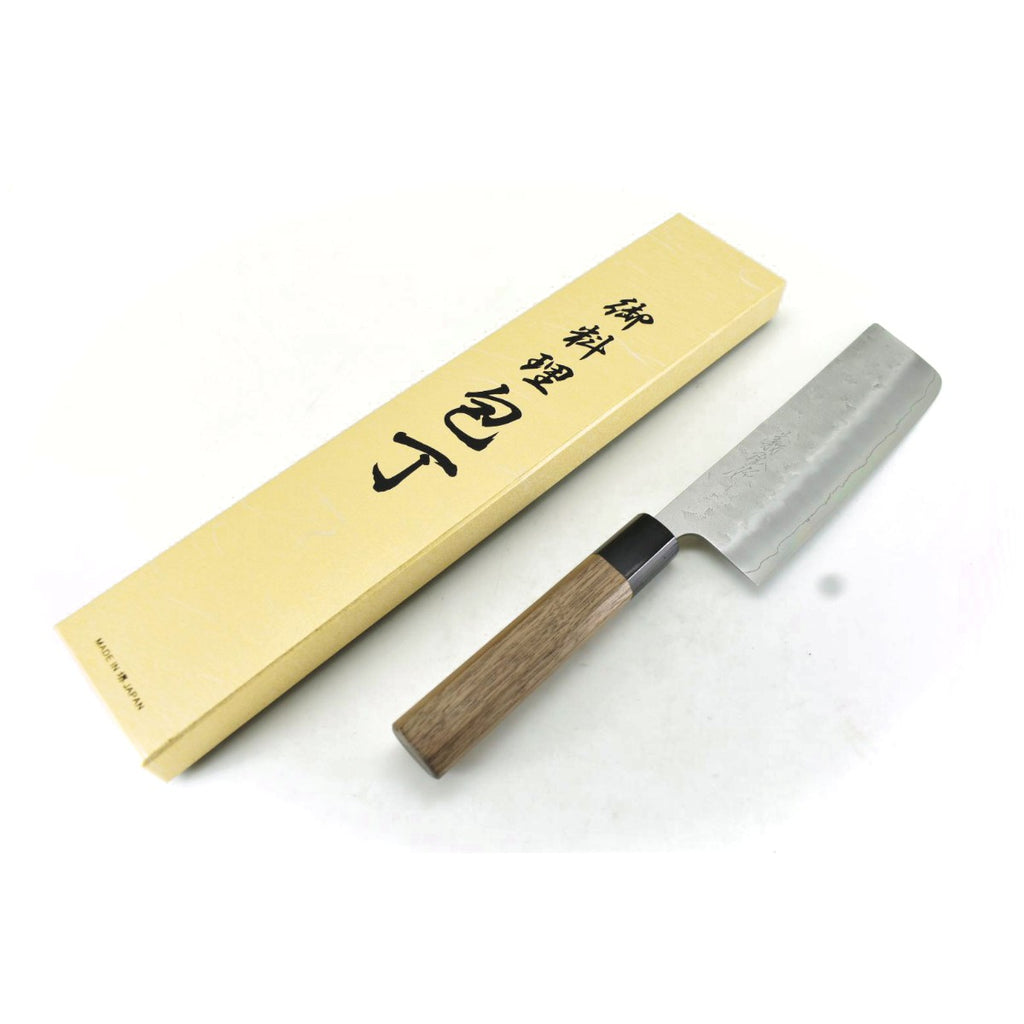 This is a Yoshihiro Nakiri /Nashiji Finish, made of GINSAN(Yasuki Silver #3 Stainless Steel) at the core of the blade, squeezed into Stainless Steel(known as "Warikomi method"), with Octagonal Walnut Handle.