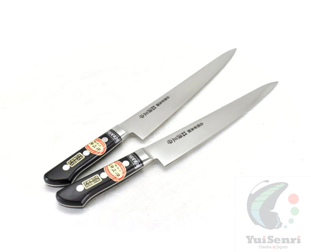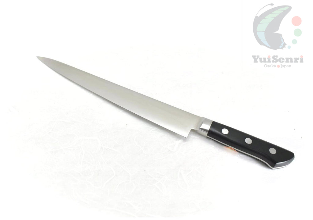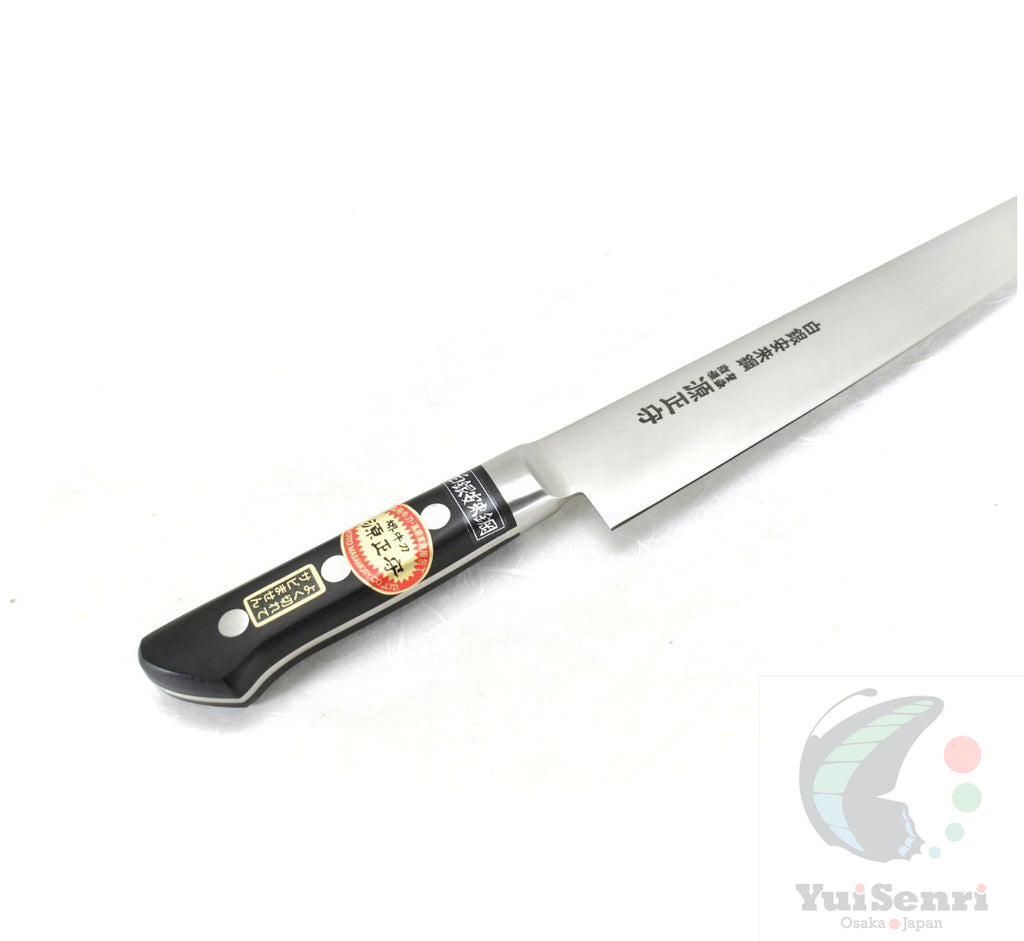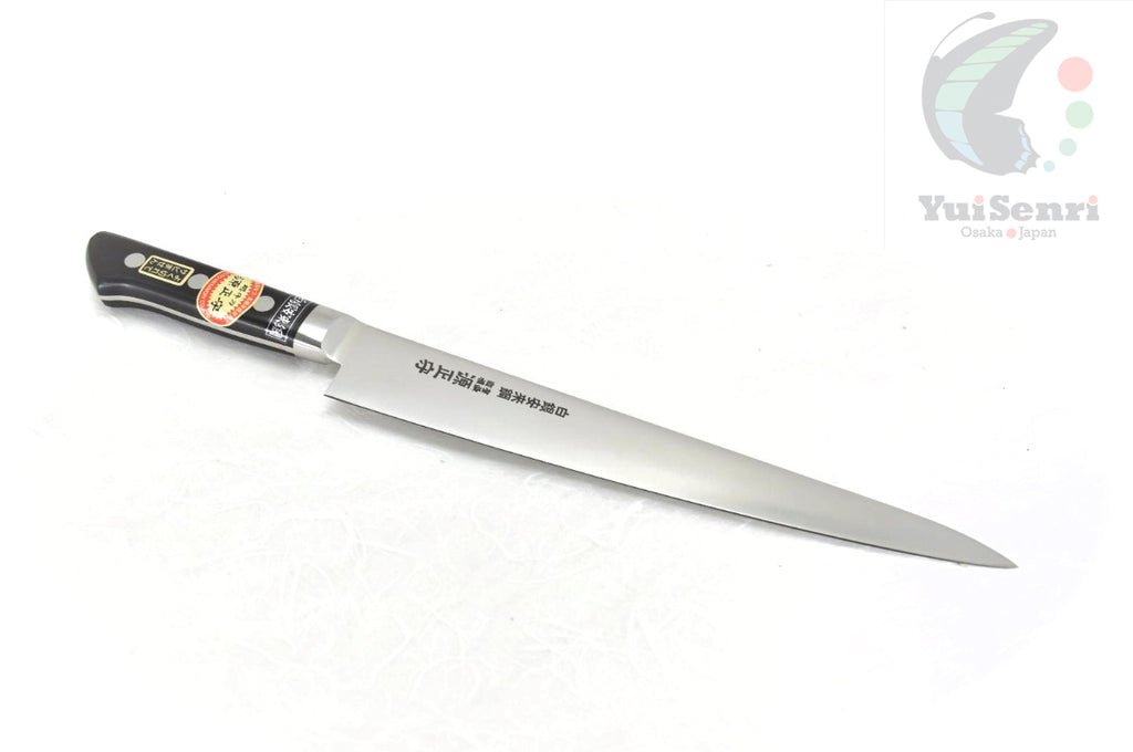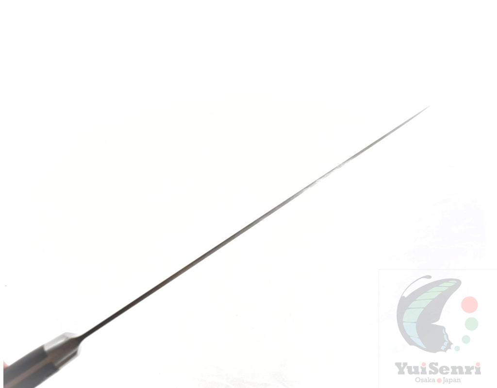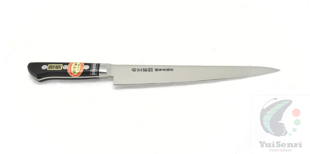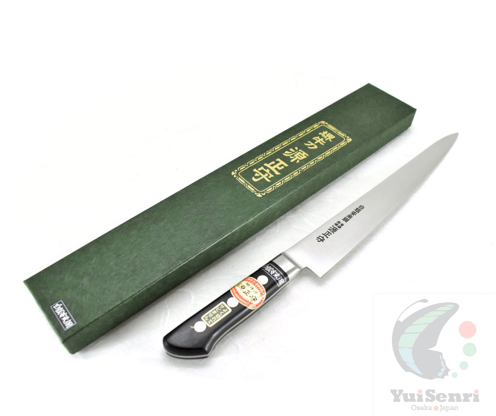 This is a Minamoto Masamori Stainless Sujihiki/Slicer, made of HAKUGIN Yasuki Steel(Japanese High Carbon Stainless Steel), with Western Style of Black Composite Handle. Highly recommended for Professionals.