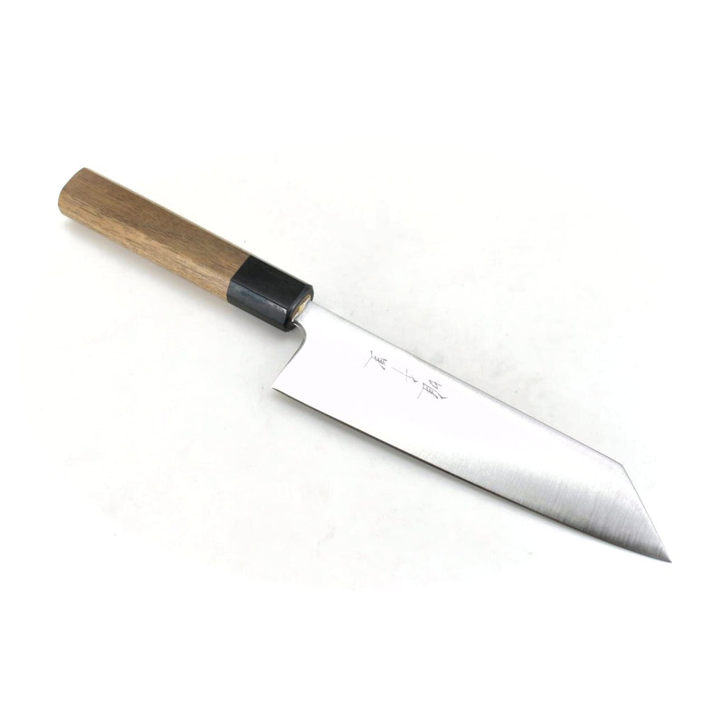 This is a YuiSenri Original Kengata Santoku(also known as Bunka) 170 mm, made of Aogami Super(Yasuki Blue Steel) at the core of the blade, squeezed into Stainless Steel(known as "Warikomi method") with Octagonal Walnut Handle.
