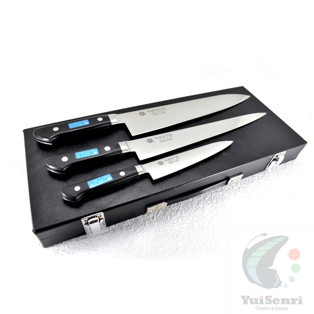 This is a Sakai Takayuki GIFT BOX 3 Knife Set(INOX Gyuto 270 mm, Sujihiki 270 mm & Paring Knife 150 mm with antibacterial PC Black Handle. Comes with Original Attache Case for 3 Knives!!
