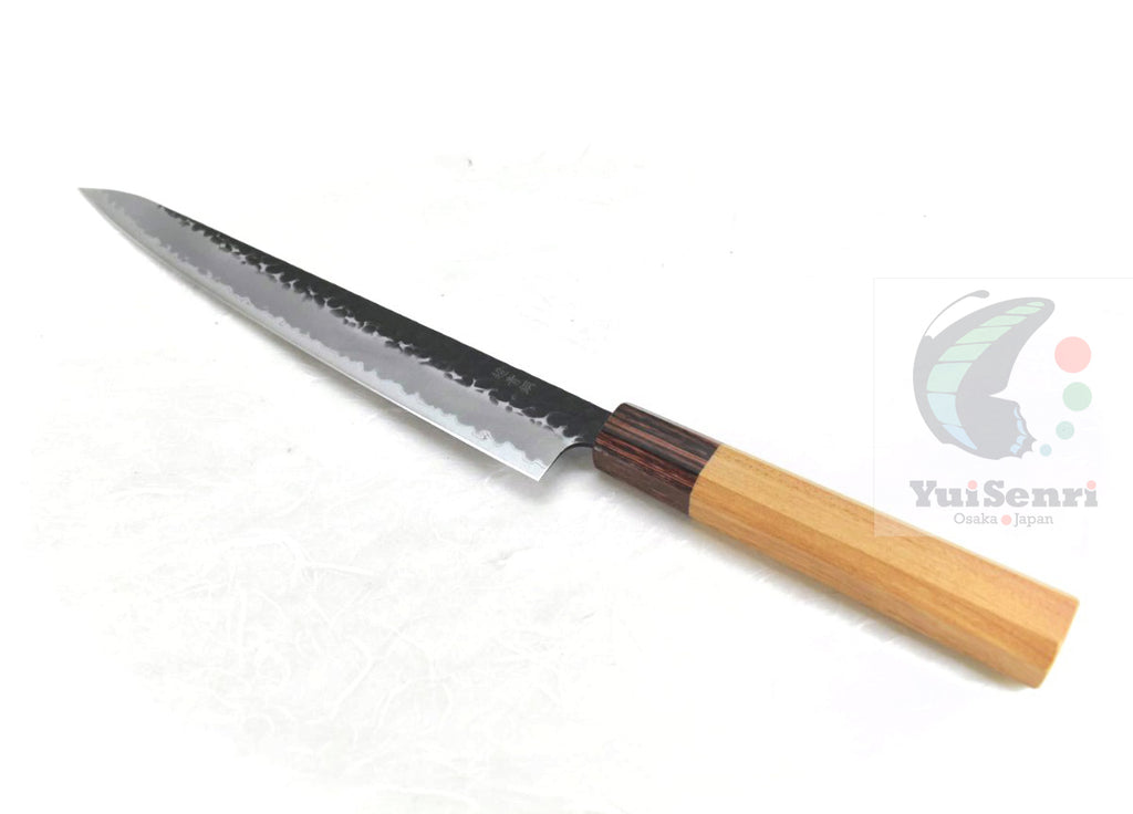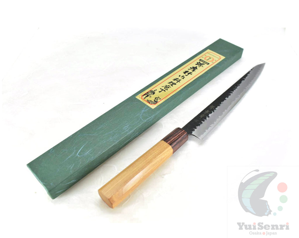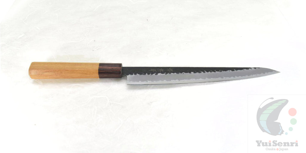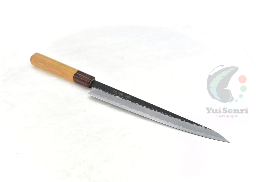 This is a Sakai Takayuki Sujihiki Slicer 240 mm Black Hammered Finish, made of Aogami Super at the core of the blade, squeezed into Stainless Steel (Known as "Warikomi method") with Octagonal Zelkova Wood Handle.
