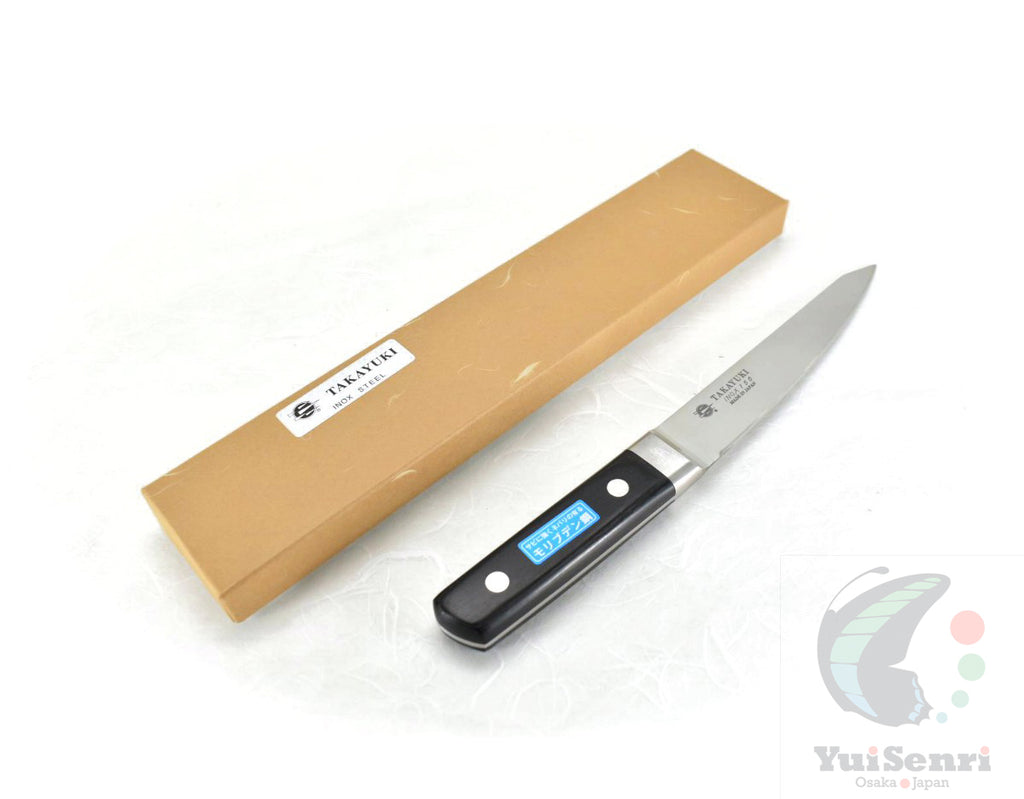 This is a Sakai Takayuki Stainless Honesuki Maru type 150 mm, made of INOX Molybdenum Stainless Steel, containing Chrome Molybdenum from Aoki Hamono Co.,Ltd.